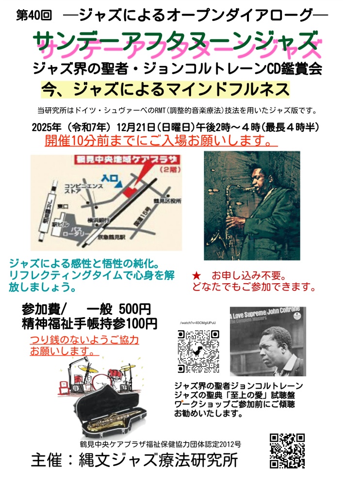 2025年7月度【定例会】は鶴見中央ケアプラザの都合により6日、日曜日開催となりました。7月はコルトレーン月命日に当り、1967年厚生年金会館でのジョン・コルトレーンインジャパン収録CDをおかけします。