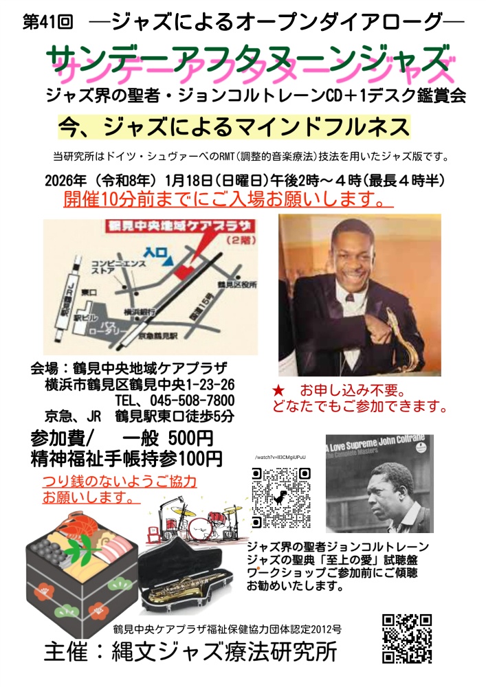 横浜市鶴見区精神科医小原博先生曰わく、ジャズはパーソネル間の即興という開かれた対話で成り立つ音楽でオープンダイアローグだよ。と述べられた。